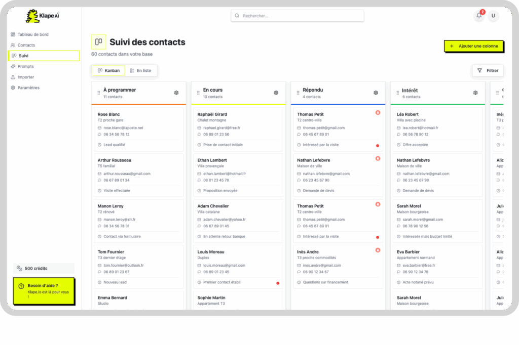 Absolument. Klape AI intègre un CRM complet : tableau de bord, vue Kanban, fiches contacts, historique des interactions, filtres, statut de chaque prospect, relances stoppables ou modifiables. Tout est centralisé, vous n’avez pas besoin d’un autre outil externe