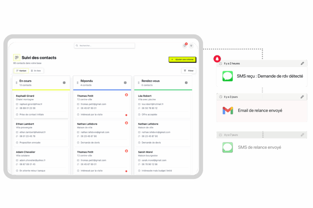 Tous vos contacts, messages, relances et conversations dans un seul outil. Vous pilotez sans friction, sans empiler les logiciels.